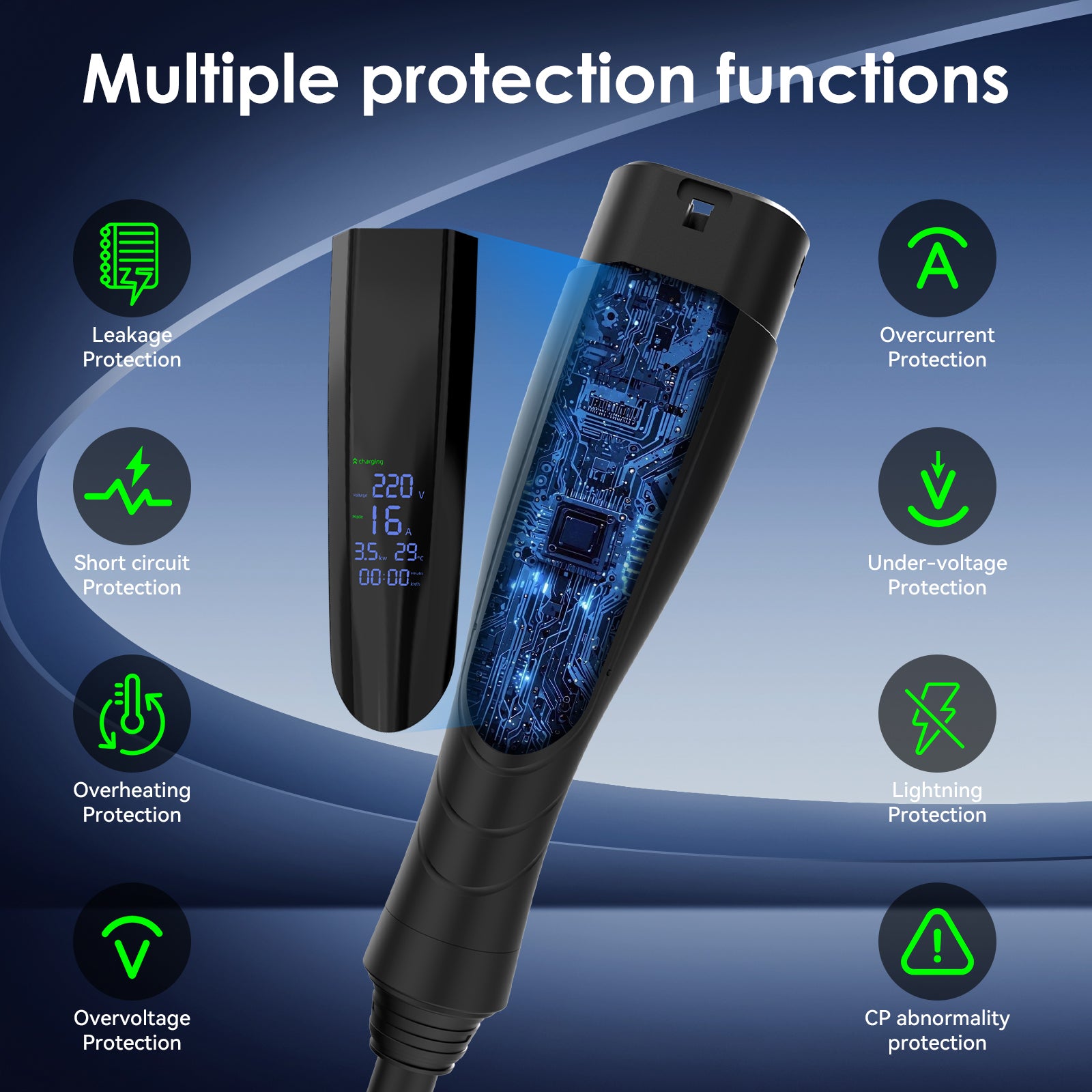 Stop guessing your charging status. The high-definition LED screen integrated into the handle provides real-time data. Track your voltage, current, power consumption, and total energy (kWh) in one glance. It even monitors the internal temperature to ensure everything is running cool and safe.